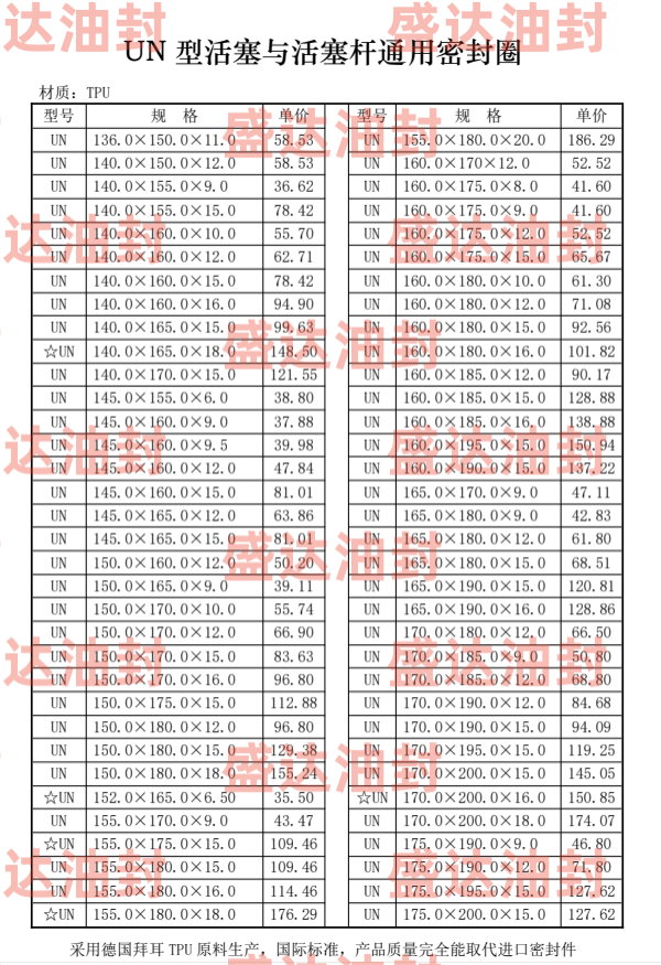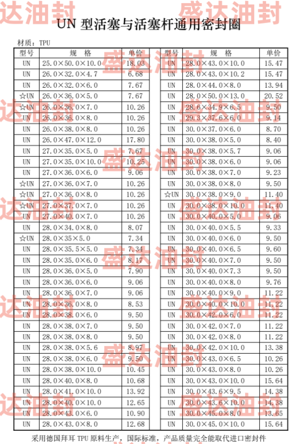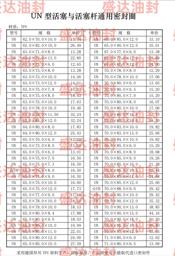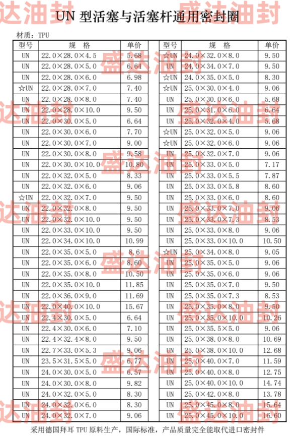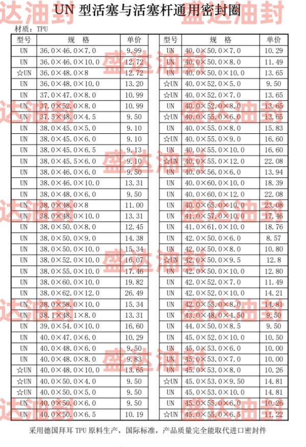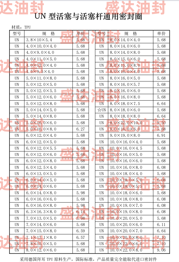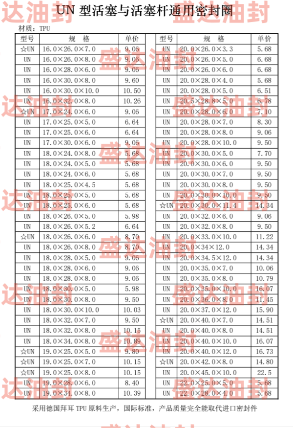 概 述 UN型密封圈是单向作用的密封元件,在液压缸中,主要用于活塞杆密封,在很多种应用场合,特别是在行走机械、汽车、林业和采矿机械中,在恶劣的工作条件下,具有良好的机械特性。在重载场合,它与RS型斯特封联合使用具有非常好的效果。 优 点 除上面述及的优点,以及具有良好的密封效果、安装简便等优点外,该密封元件还具有在低压范围内摩擦较小的优点。 应用范围 适用于活塞杆密封,应用场合广泛,特别是在行走机械、汽车、林业以及采矿机等液压装备中的应用更为广泛。 技术参数 压力:≤32Mpa,当压力高于20MPa时,建议使用挡圈。 温度:-30℃~+80℃ 速度:往复≤0.8m/s 介质:石油基液压油、乳化液、不适用于环保安全液压油(生物油) 材 料 高性能进口聚氨酯(TPU),邵氏硬度(SHA)93° 安装要求 为保证密封件在安装过程中不受到损坏,必须严格按密封件安装要求进行安装。 订货示例 活塞杆直径:d=50.0mm 订货型号:UN 50 65 10