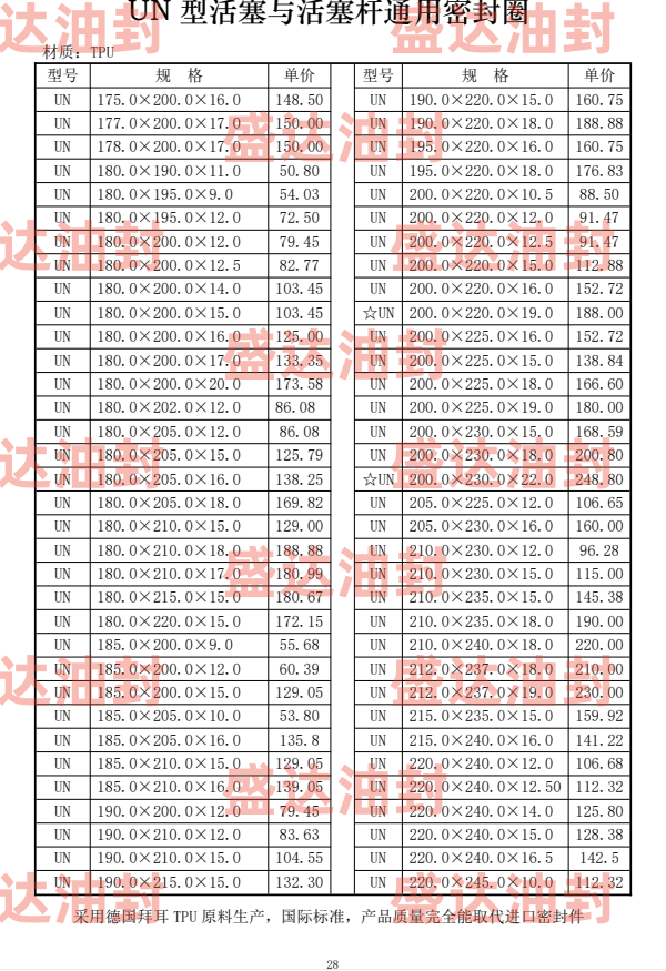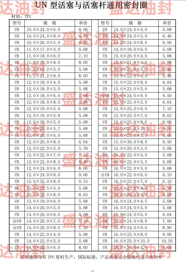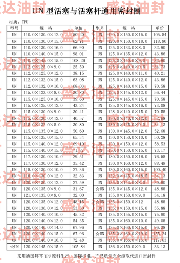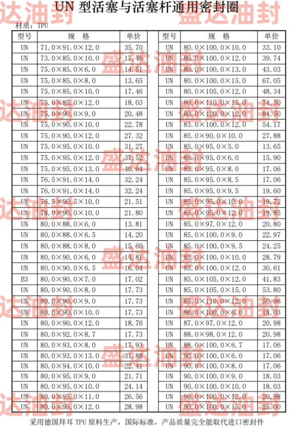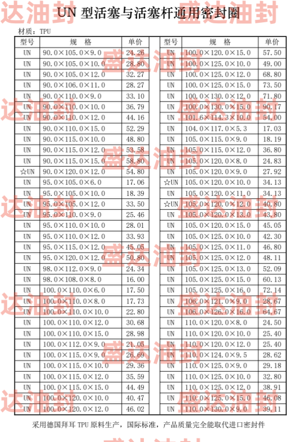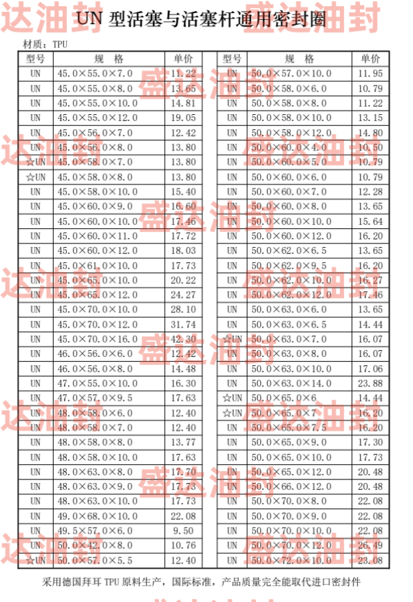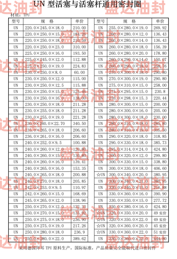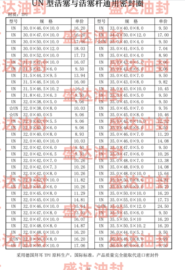 概 述 UN型密封圈是单向作用的密封元件,在液压缸中,主要用于活塞杆密封,在很多种应用场合,特别是在行走机械、汽车、林业和采矿机械中,在恶劣的工作条件下,具有良好的机械特性。在重载场合,它与RS型斯特封联合使用具有非常好的效果。 优 点 除上面述及的优点,以及具有良好的密封效果、安装简便等优点外,该密封元件还具有在低压范围内摩擦较小的优点。 应用范围 适用于活塞杆密封,应用场合广泛,特别是在行走机械、汽车、林业以及采矿机等液压装备中的应用更为广泛。 技术参数 压力:≤32Mpa,当压力高于20MPa时,建议使用挡圈。 温度:-30℃~+80℃ 速度:往复≤0.8m/s 介质:石油基液压油、乳化液、不适用于环保安全液压油(生物油) 材 料 高性能进口聚氨酯(TPU),邵氏硬度(SHA)93° 安装要求 为保证密封件在安装过程中不受到损坏,必须严格按密封件安装要求进行安装。 订货示例 活塞杆直径:d=50.0mm 订货型号:UN 50 65 10